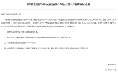 5月30日,据证监会网站消息,国科天成科技股份有限公司(简称:国科天成)创业板IPO注册生效。此外,上交所官网显示,因上海芯旺微电子技术股份有限公司(简称:芯旺微)及其保荐人撤回申请,上交所决定终止对其首次公开发行股票并在科创板上市的审核。