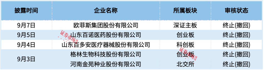据统计, 9月2日至9月8日,沪深北三大交易所共有5家企业IPO终止 ,其中包括欧菲斯集团股份有限公司、山东百诺医药股份有限公司等。分板块来看,其中,深证主板1家、创业板2家、科创板1家、北交所1家。