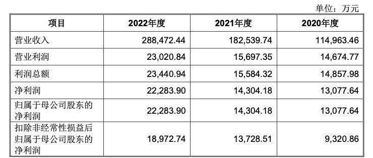 财务数据方面,天和磁材营收净利可谓是节节高升。招股书显示,2020年-2022年(以下简称报告期内),公司营收为11.50亿元、18.25亿元及28.85亿元;净利1.31亿元、1.43亿元及2.23亿元。