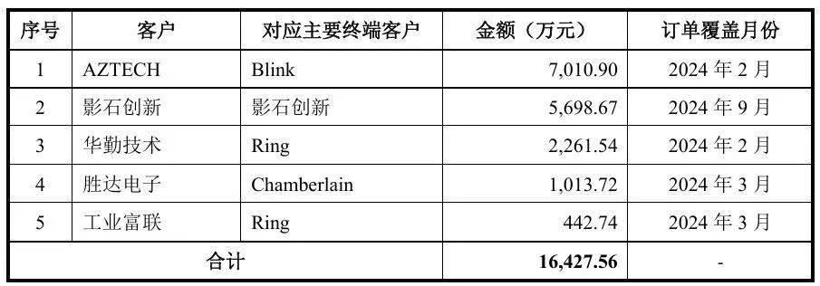除了影石创新之外,弘景光电还与AZTECH、华勤技术、胜达电子等客户达成了合作,对应的终端品牌客户包括Ring、Blink、Chamberlain等厂商,其中AZTECH截止同期的在售订单金额为7010.90万元,高于影石创新。