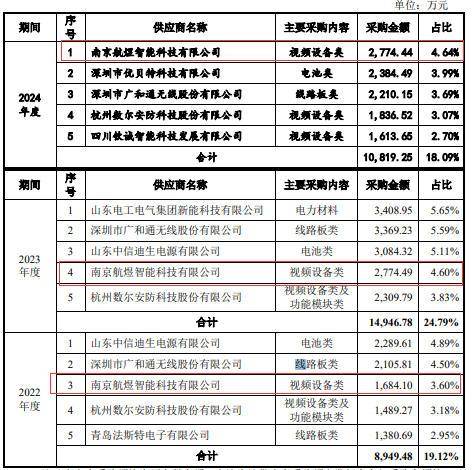 供应商方面,招股书显示,2019年-2024年间,南京航煜智能科技有限公司均是信通电子的前五大供应商之一,采购金额分别为722.17万元、1108.44 万元、1787.92 万元、1684.1万元、2774.49万元和2774.44 万元。其中,2024年南京航煜智能科技有限公司是信通电子的第一大供应商。
