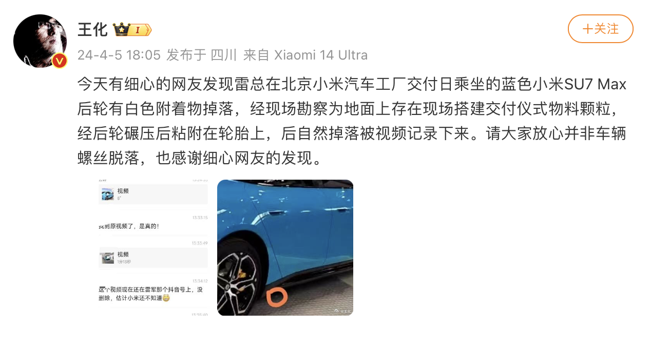 对此,小米集团公关部总经理王化于4月5日发文回应称,“经现场勘察为地面上存在现场搭建交付仪式物料颗粒,经后轮碾压后粘附在轮胎上,后自然掉落被视频记录下来。请大家放心并非车辆螺丝脱落,也感谢细心网友的发现。 ”