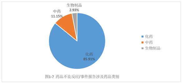2023年药品不良反应/事件报告中,涉及已分类怀疑药品36648例次,其中化学药品占85.91%,生物制品占2.93%,例次数排名前5位的类别依次为抗感染药、肿瘤用药、心血管系统用药、呼吸系统用药、镇痛药。其中,前三种药物的排名与国家药监局发布《国家药品不良反应监测年度报告(2023年)》中化学药品不良反应例次数排名相同。