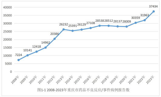 2023年度重庆全市共收到《药品不良反应/事件报告表》37434份。2008年至2023年,重庆市药品不良反应监测中心累计收到《药品不良反应/事件报告表》382943份。