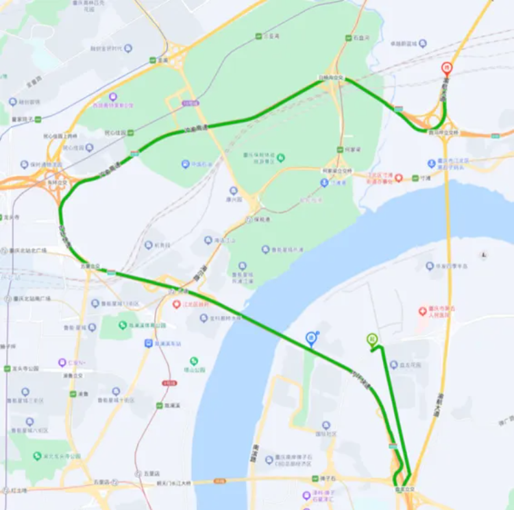 腾龙大道→朝天门大桥→五童立交→东环立交→跑马坪立交→渝航大道