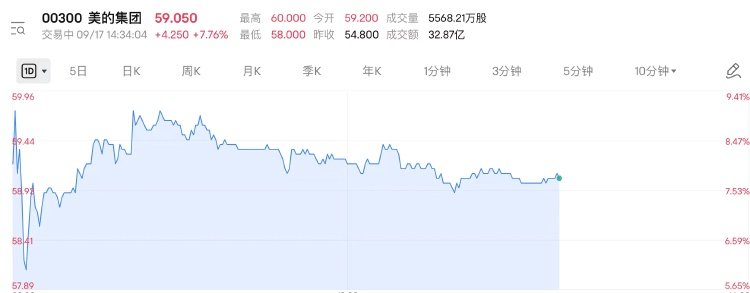截至发稿,美的集团港股报59.05港元/股,较发行价54.8港元涨近8%,盘中最高一度涨近10%。