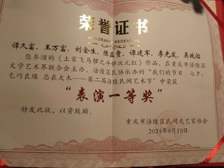 8月10日,“七巧良缘·恋在大木——第二届涪陵民间艺术节”在涪陵区大木乡举行,沙子仁合狮锣文化艺术团应邀选送了《土家飞马锣之斗锣状元红》作品。队员们生动活泼、淋漓尽致的表演,让现场数千名观众随着鼓锣强劲的节奏心潮澎湃、呼声呐喊。最终,该作品斩获表演一等奖,7名队员载誉而归。