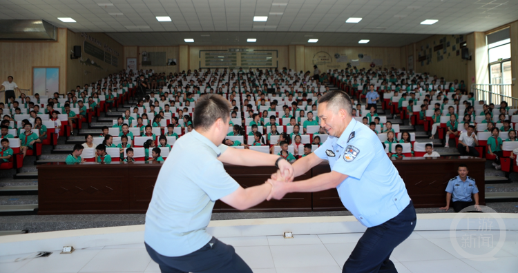 “当被人抓住手臂时,可以向对方的虎口发力,快速挣脱”在情景互动环节,市人大代表周先进走上讲台,与唐仕春一同为学生们讲解了徒手解脱、徒手防御等应对校园欺凌的自我保护措施。