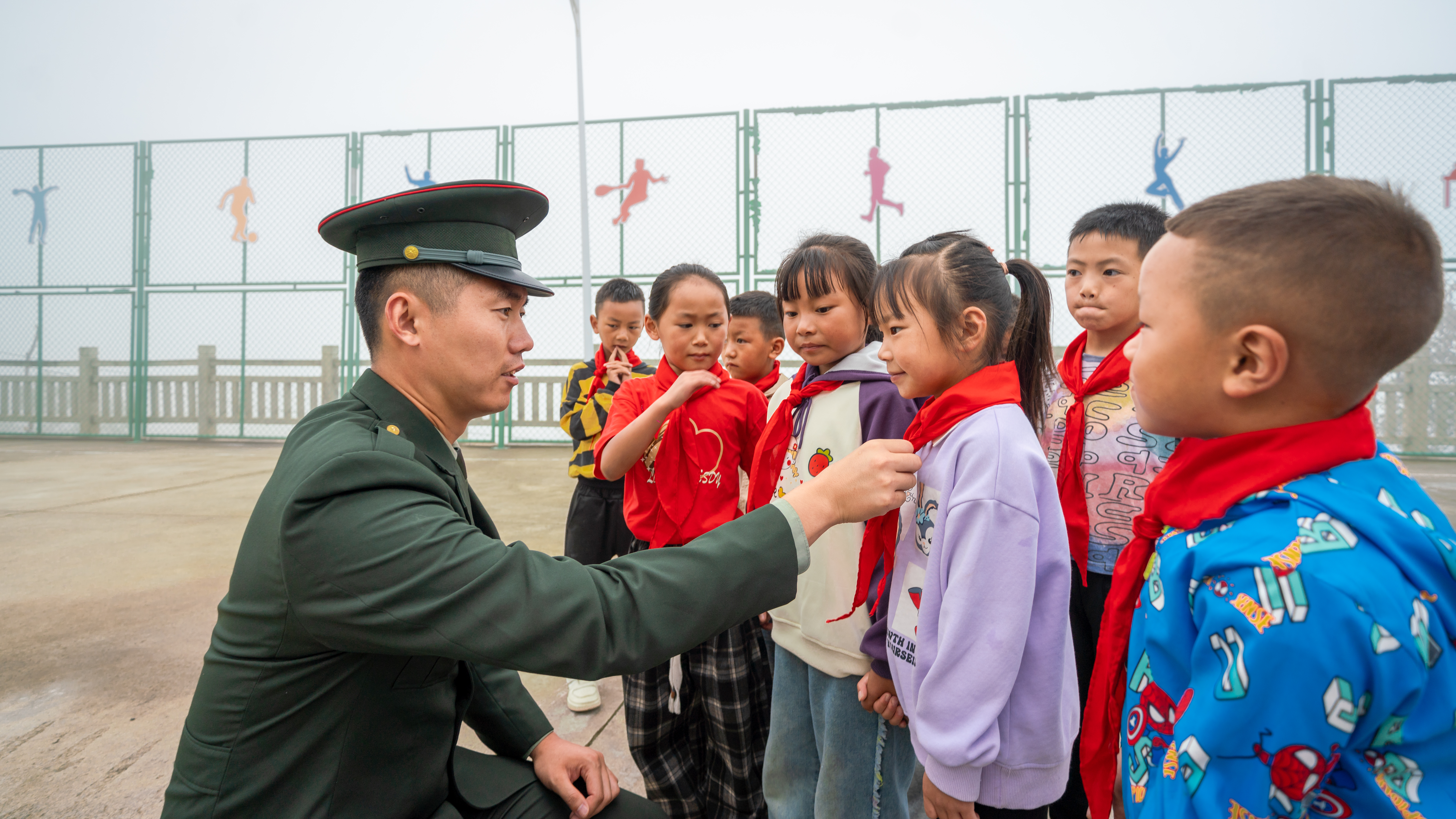 升旗仪式前,张自轩为二坪村小学的孩子们整理红领巾。长城网·冀云客户端记者 霍少轩 摄