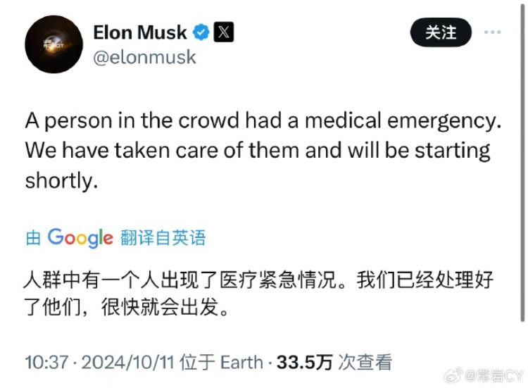 10:32 在活动现场有人晕倒。马斯克在推特上回复称,由于有人需要紧急医疗,特斯拉将在开场之前先照顾他们。