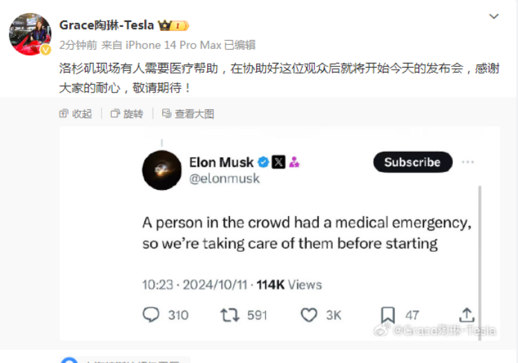 针对发布会推迟,特斯拉对外事务副总裁陶琳也在微博上发文解释。