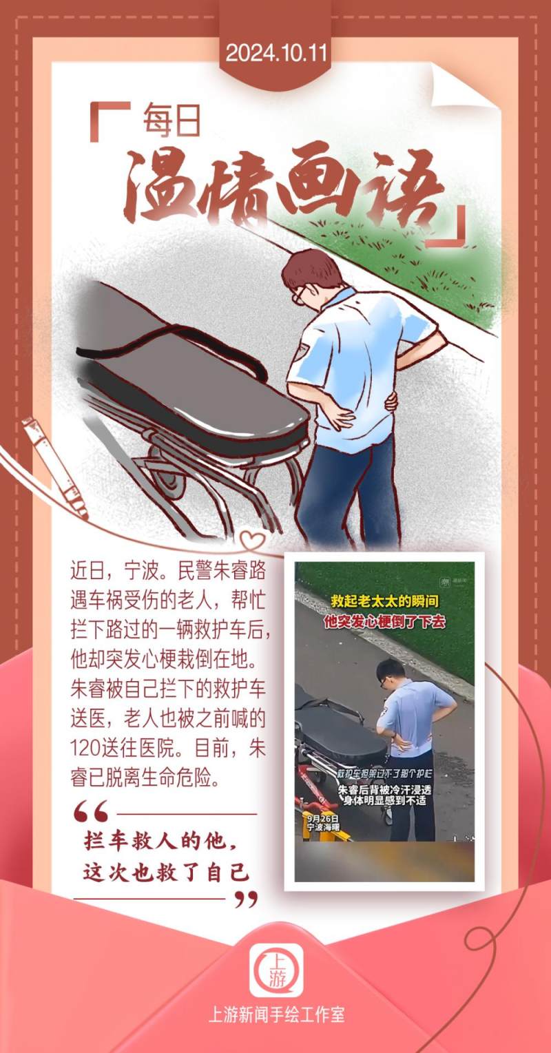 近日,宁波。民警朱睿路遇车祸受伤的老人,帮忙拦下路过的一辆救护车后,他却突发心梗栽倒在地。朱睿被自己拦下的救护车送医,老人也被之前喊的120送往医院。目前,朱睿已脱离生命危险。