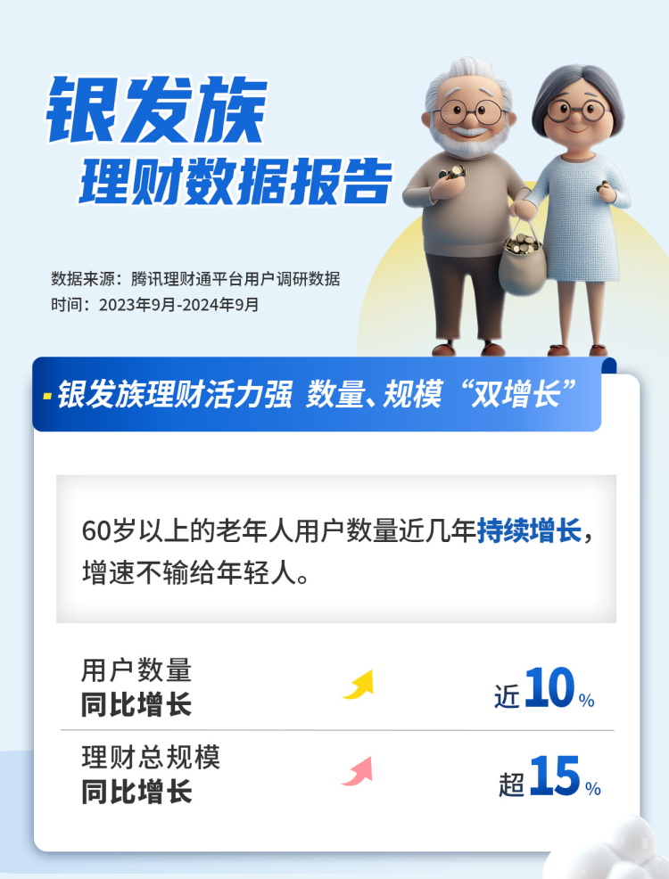 近日A股交易行情火爆,大量投资者跑步入场,在投资风潮下,有些老年人选择进股市搏一把,也有的选择稳健理财。在重阳节来临之际,为关注不同老年人群体的理财方式,腾讯理财通发起用户调研,数据显示,过去一年60岁以上的老年人理财数量及理财规模实现“双增长”,分别同比增长10%和15%。银发族理财需求旺盛,理财意识和参与度明显提升。