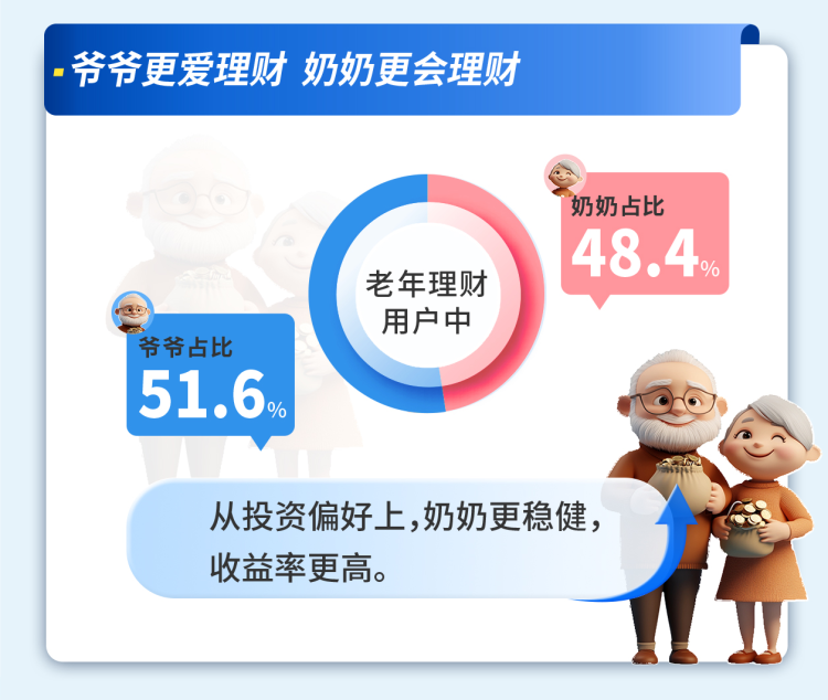 有意思的是,爷爷比奶奶“更爱理财”。在老年人用户中,爷爷占比51.6%,奶奶占比48.4%。但奶奶却比爷爷“更会理财”,从投资偏好上,奶奶更稳健,因此收益率更高。