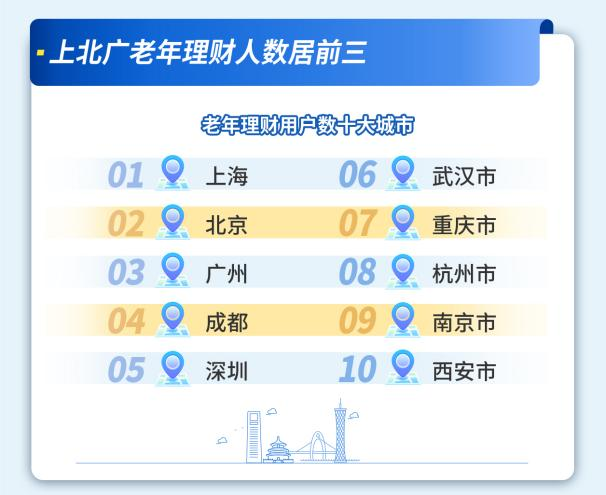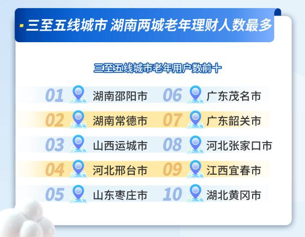 而三至五线的小城市老年理财人数的排名,湖南邵阳市和常德市分别排第一和第二,山西省运城市、河北省邢台市紧跟其后。