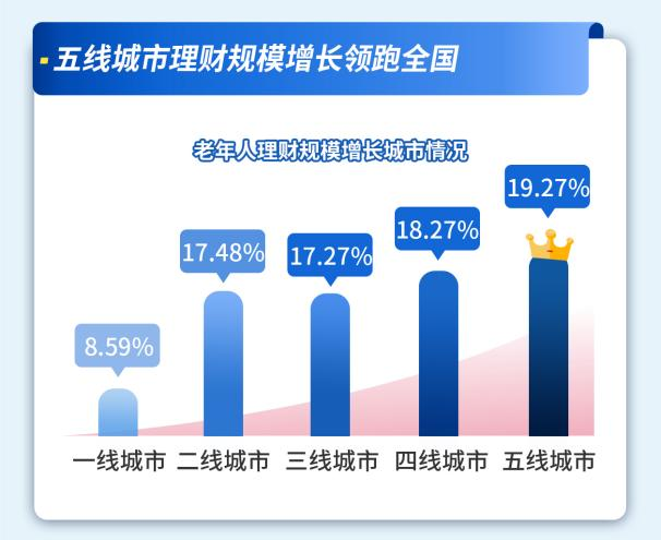 数据显示,在过去几年全国老年理财人数持续增加,上海、北京、广州、成都、深圳跻身全国5强。在规模增速方面,五线城市领跑全国,2023年理财规模增长高达19.3%。四线城市紧跟其后。