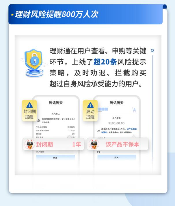 腾讯理财通以投资者利益为先,为老年用户提供“多重守护”,把养老钱的安全性放在第一位。从2023年5月起,理财通在用户查看、申购、持有基金等核心路径的产品页面上,上线了超过20条的风险提示策略。针对老年人购买超过自身风险承受能力的产品,理财通进行劝退与提醒,累计超过800万人次,很好地帮助老年人规避风险,助力老人安享晚年。