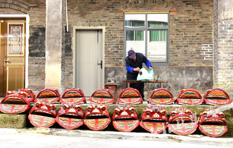 记者在现场看到,老人家门口并排摆放着10多个已制作好的土狮狮头,狮头造型极具神韵,惟妙惟肖,工艺精湛、制作精细。
