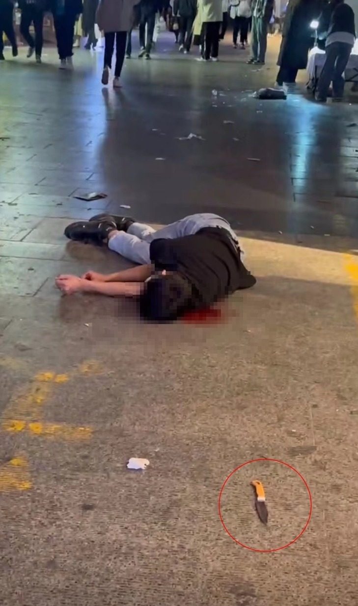 另外一个角度的视频显示,男子倒在地上,颈部有一滩血,前方地面有一把尖刀。