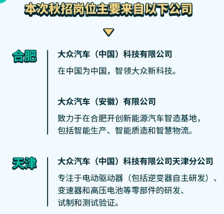 记者查阅大众智能电动汽车中心招聘微信公众号也看到,8月末以来,该账号发布有关大众汽车(中国)2025届校园招聘的消息,主要岗位来自合肥和天津。