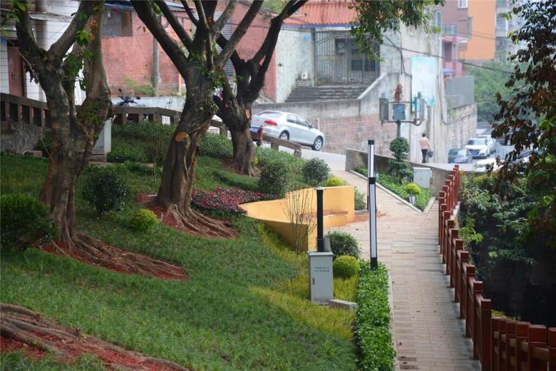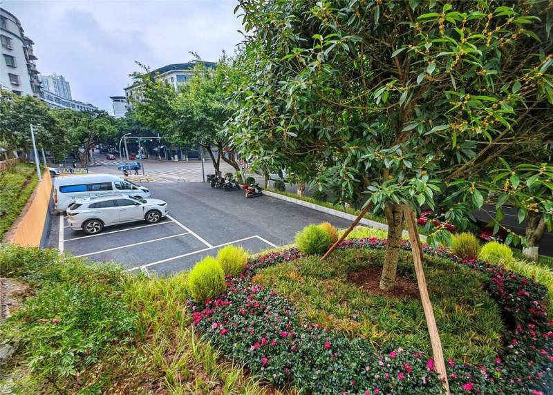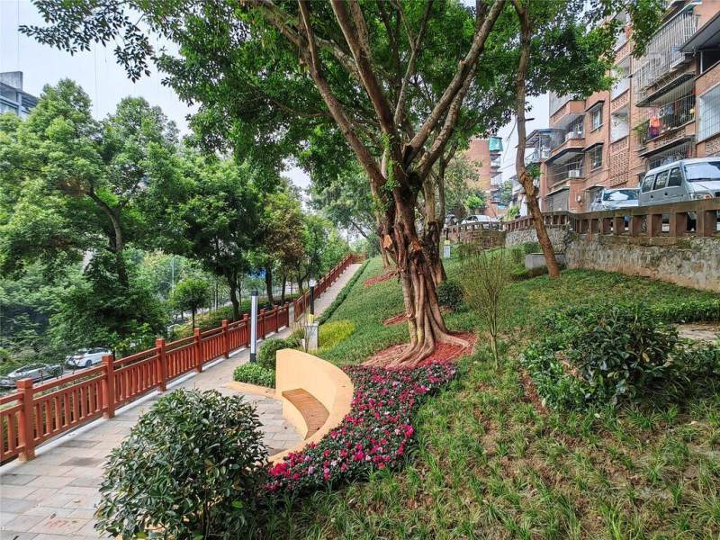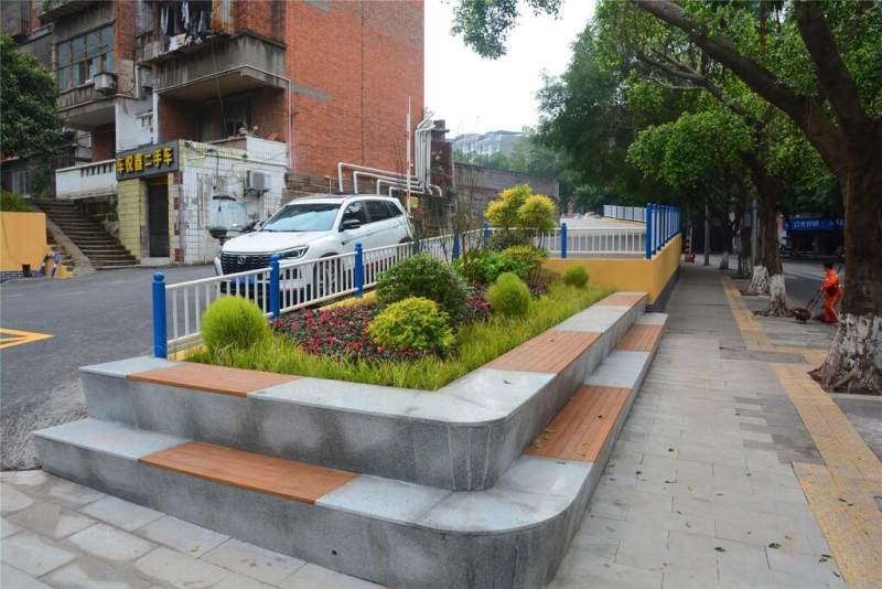 永川区城市管理局组织设计施工队伍结合现场条件和周边居民需求,通过合理布局、新增功能激活场地价值,使有限的空间尽量发挥出了更大的作用。现场修剪保留了高大乔木,因地制宜新建停车场、砌筑花台、更换老旧人行道板、新增休憩设施、安装防护栏杆、栽植地被植物等措施,解决了附近区域停车难、绿化植被少、基础设施损坏、休憩空间欠缺等问题,有效改善了两处老旧区域居住环境,切实提升了群众获得感和幸福感。