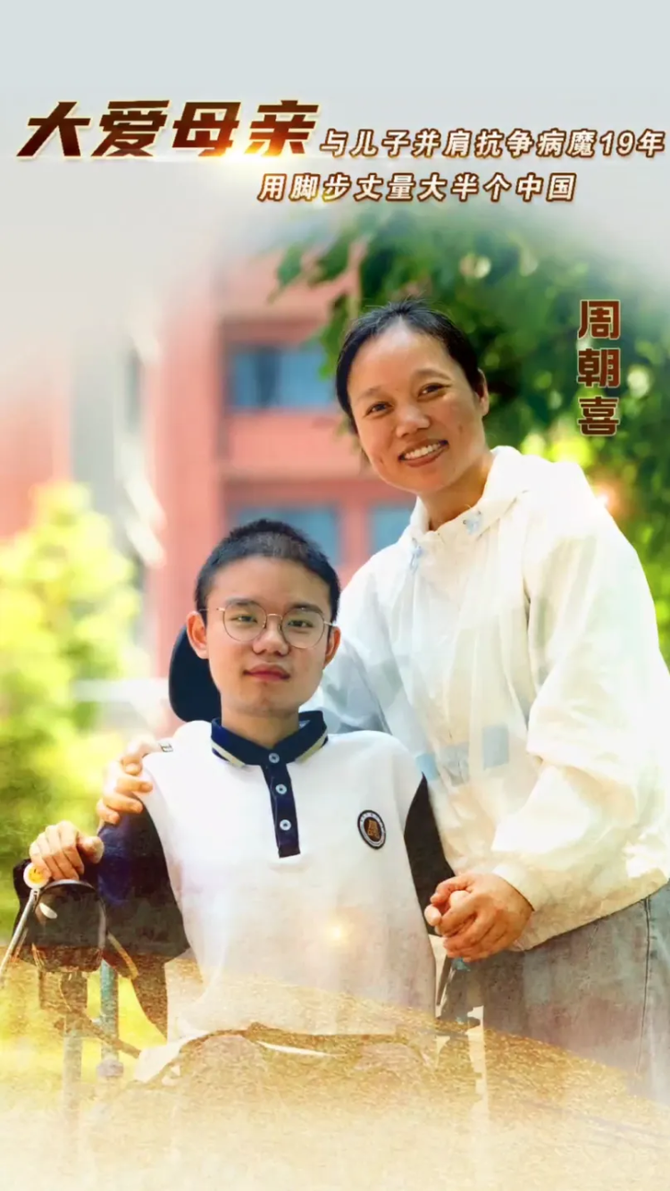 作为孝老爱亲的“中国好人”,周朝喜与患有罕见病的儿子罗睿燊并肩抗争病魔19年的故事,早已感动万千读者。儿子罗睿燊出生15天,便查出患有苯丙酮尿症,5岁半时又被诊断为进行性肌营养不良,11岁半后只能靠坐轮椅代步。19年来,母子俩以乐观积极的态度与病魔抗争。在周朝喜的悉心照料下,罗睿燊不仅打破了“活不过18岁”的预言,如今在周朝喜的悉心照料下,阳光开朗的罗睿燊已经步入大学,他和妈妈也利用一个又一个的暑假,走遍了大半个中国,脚步遍布100多个城市。
