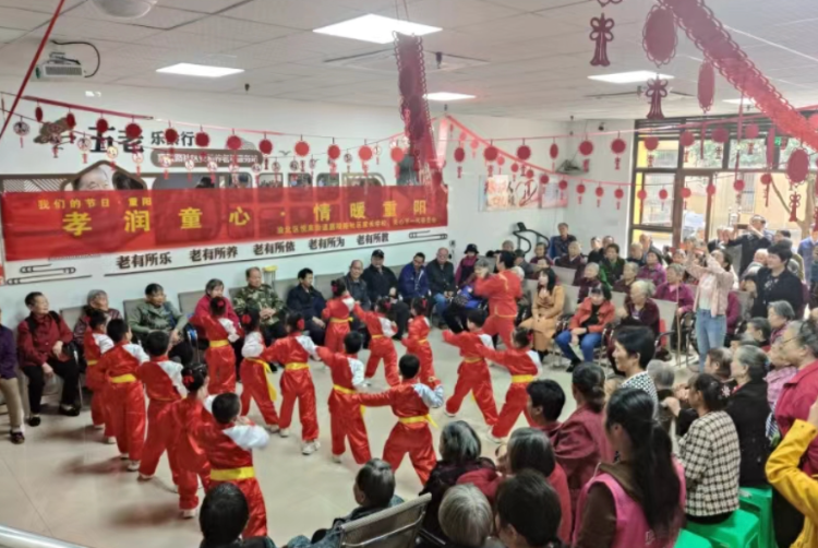来自悦城幼儿园的20多名小朋友与嘉陵路社区的老人们一起,度过了这个愉快的重阳佳节。志愿者小朋友们穿戴一致,排列整齐,为老人们献上了一曲气势恢弘的“国学武术操”,并用稚嫩的小手为老人们捶肩捏背,现场欢笑不断,老人们精神矍铄,一片慈爱纯然肺腑。