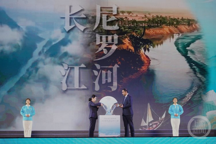 在开幕式的汇水仪式上,长江水与尼罗河水缓缓交融在一个小小的水瓶内,此刻大河文明在此汇聚,两大河流的交融也是以白鹤梁、尼罗尺为代表的古老遗产传承千年、跨越万里的双向奔赴,凝聚着和合共生的美好期许。