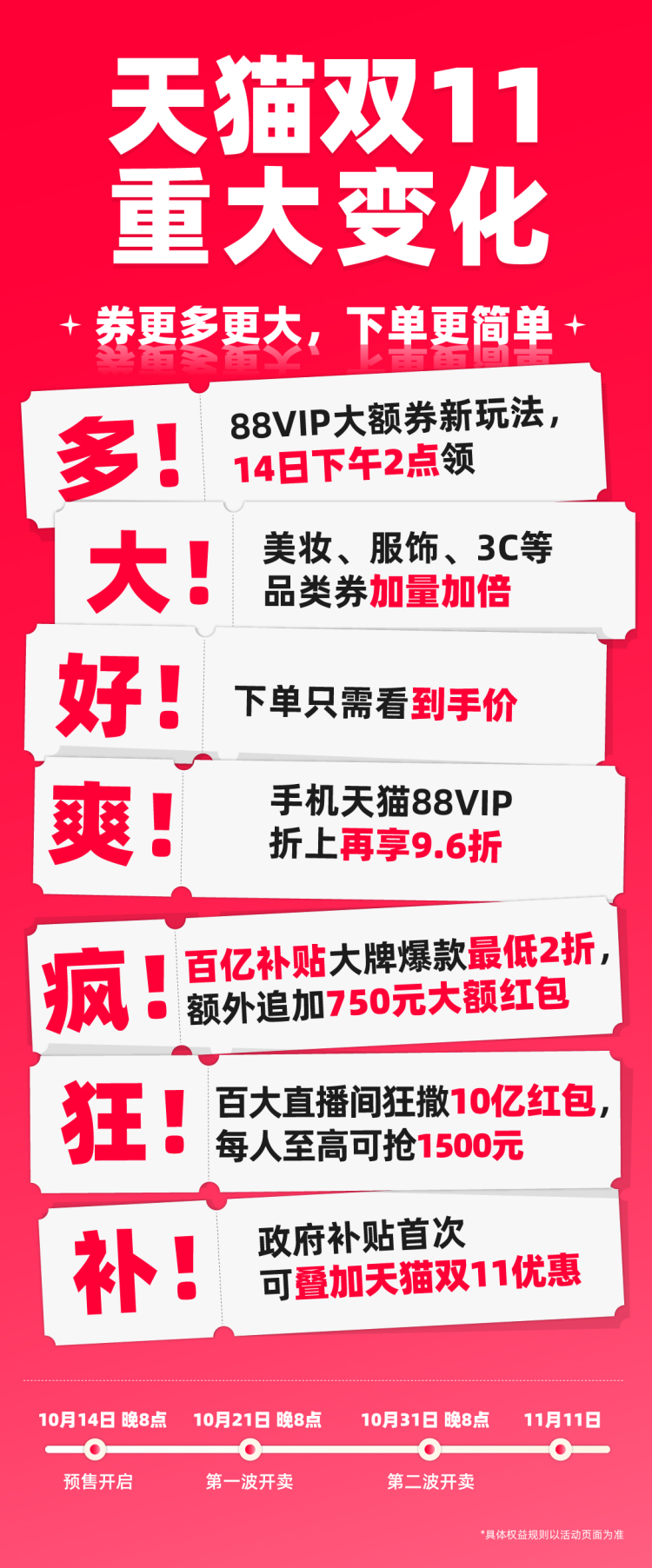 定了!2024年天猫“双11”将于10月14日晚上8点准点开启。