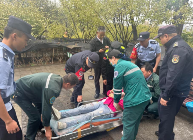 10月1日上午,队员林杰巡查至凌云路梅园对面步道时,发现一游客倒地不起。林杰赶紧上前,询问得知是因雨天路面湿滑,自己不小心脚滑摔倒。待游客休息一阵疼痛缓解之后,将其扶起,搀扶至休息椅上暂时休息。为避免后续产生二次伤害,在征得游客本人同意后,林杰立即拨打120急救电话,与到场民警共同配合医护人员将游客护送上救护车。