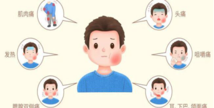 流行性腮腺炎潜伏期8~30天(平均18天),起病大多较急,无前驱症状。发病后,患者会出现发热、畏寒、头痛、肌痛、咽痛、食欲不佳、恶心、呕吐、全身不适等症状,并伴有数小时的腮腺肿痛,且症状逐渐明显,体温可达39℃以上。