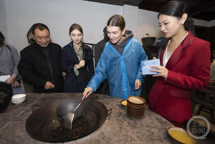 品过茶后,中外青少年们来到了油茶制作区,跟随油茶师傅学习、了解油茶的制作方法。
