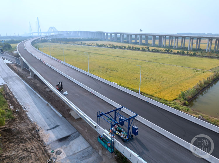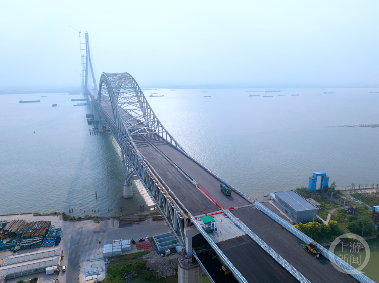 目前,南接线工程沥青上面层摊铺已顺利完成。主桥正在开展上下层钢桥面喷砂除锈及钢桥面富锌漆及防水粘接层施工,大桥机电、房建等附属工程施工也在同步进行。