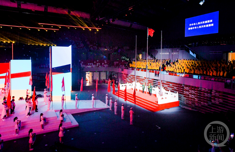 伴随着《义勇军进行曲》响起,现场观众齐声歌唱,旗手振臂一挥,国旗冉冉升起。在停在旗杆顶端的那一刻,五星红旗正好停在旗杆顶端,迎风飘扬,体育场馆内顿时成了欢乐的海洋。