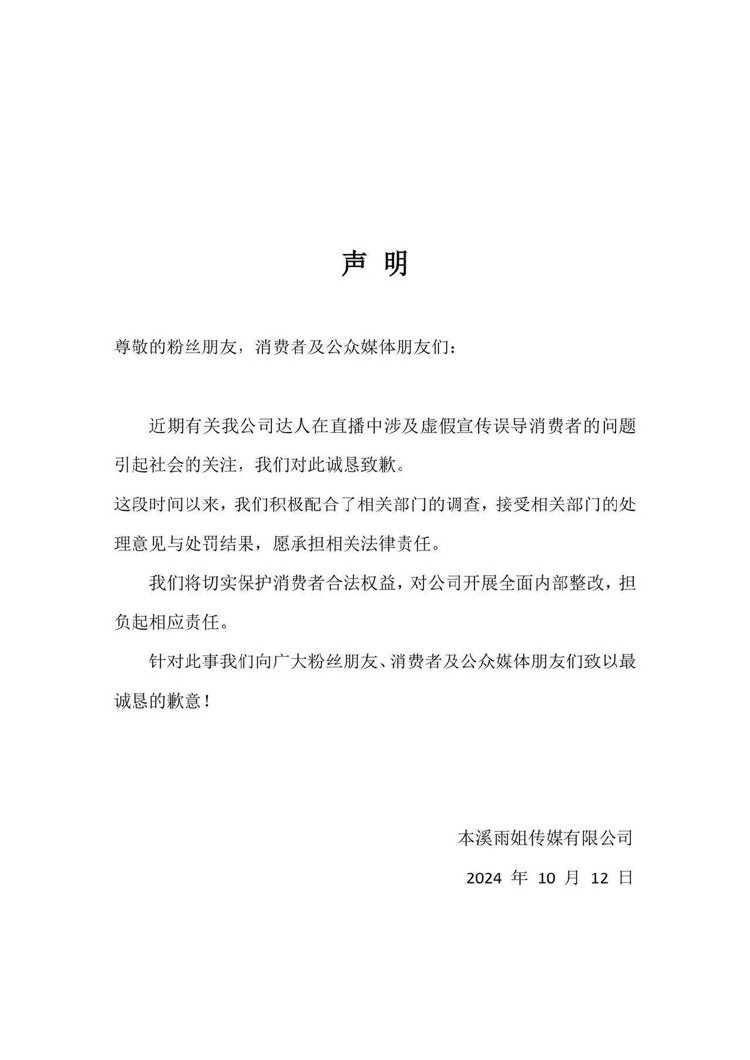 12日晚,东北雨姐所属公司雨姐传媒发布声明称,近期有关我公司达人在直播中涉及虚假宣传误导消费者的问题引起社会的关注,对此诚恳致歉。“这段时间以来,我们积极配合了相关部门的调查,接受相关部门的处理意见与处罚结果,愿承担相关法律责任。我们将切实保护消费者合法权益,对公司开展全面内部整改,担负起相应责任。”