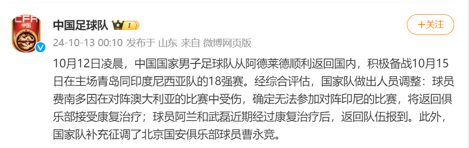 据@中国足球队 消息,10月12日凌晨,中国国家男子足球队从阿德莱德顺利返回国内,积极备战10月15日在主场青岛同印度尼西亚队的18强赛。经综合评估,国家队做出人员调整:球员费南多因在对阵澳大利亚的比赛中受伤,确定无法参加对阵印尼的比赛,将返回俱乐部接受康复治疗;球员阿兰和武磊近期经过康复治疗后,返回队伍报到。此外,国家队补充征调了北京国安俱乐部球员曹永竞。