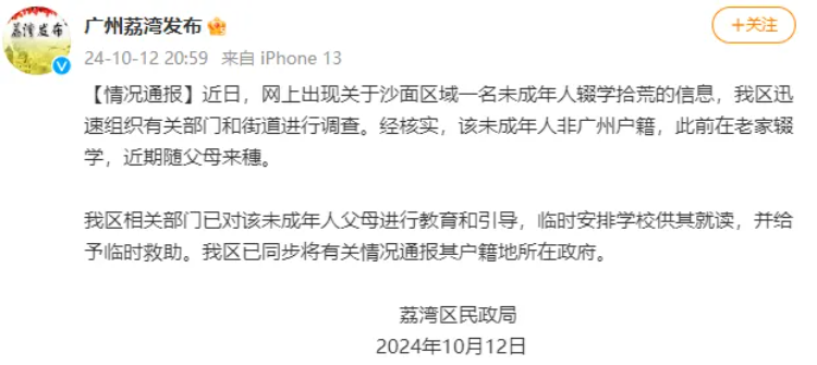 近日,网上出现关于沙面区域一名未成年人辍学拾荒的信息,我区迅速组织有关部门和街道进行调查。经核实,该未成年人非广州户籍,此前在老家辍学,近期随父母来穗。