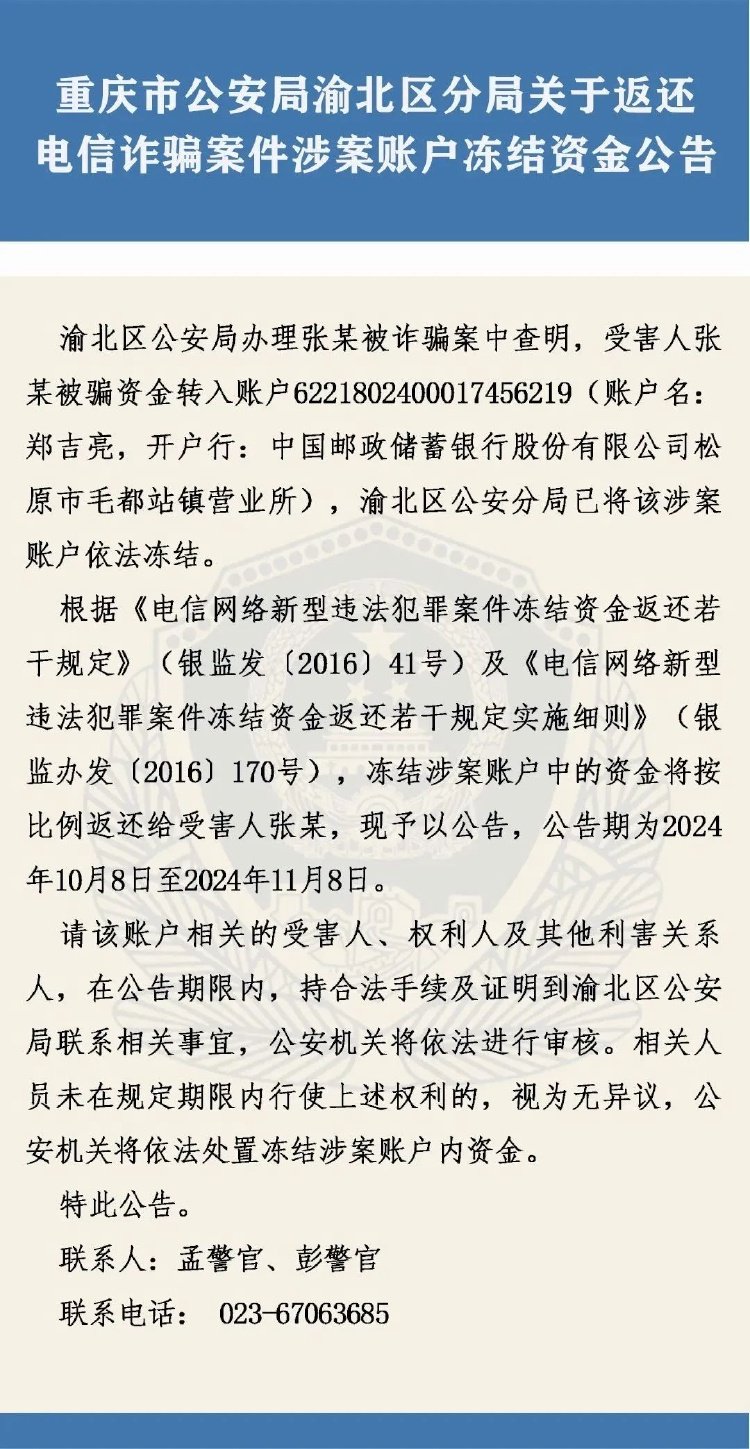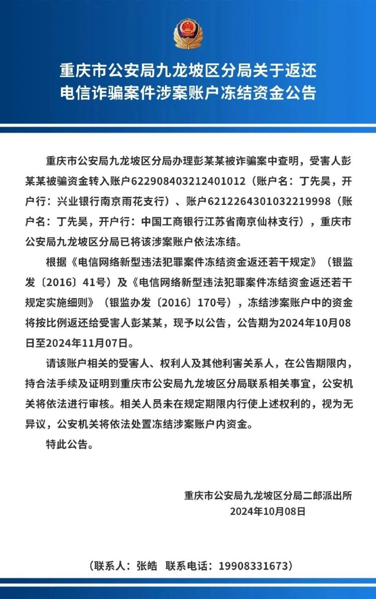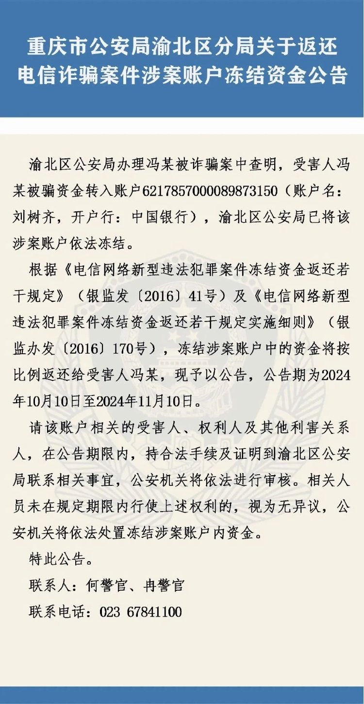 重庆日报微信公众号消息,近期,重庆警方侦破多起电信诈骗案件,并发布返还电信诈骗案件涉案账户冻结资金公告,请相关受害人联系警方,领回被骗钱财。
