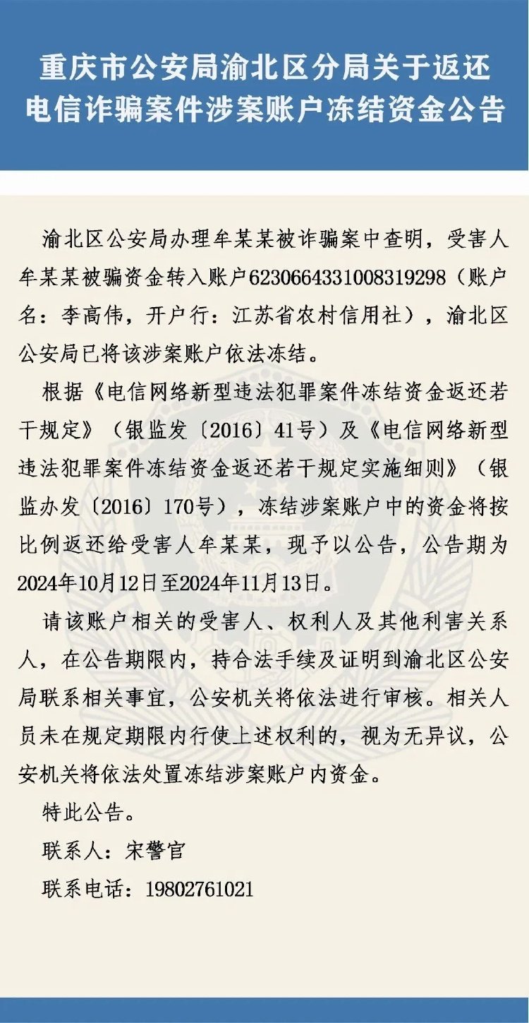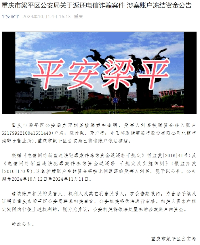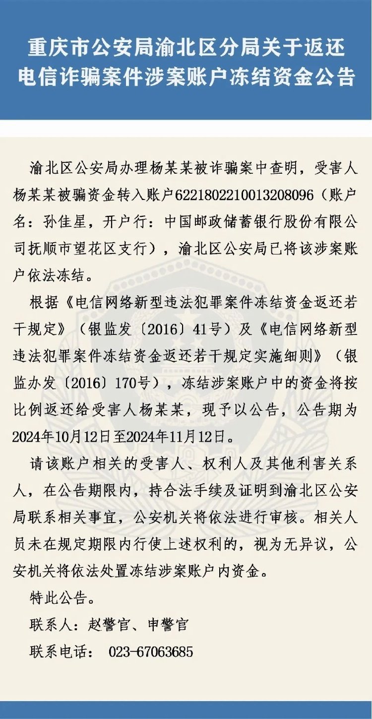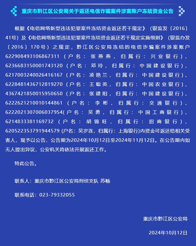 重庆日报微信公众号消息,近期,重庆警方侦破多起电信诈骗案件,并发布返还电信诈骗案件涉案账户冻结资金公告,请相关受害人联系警方,领回被骗钱财。