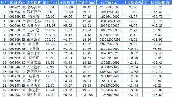 同花顺数据显示,本周20只白酒A股,其中上涨2只,下跌18只。