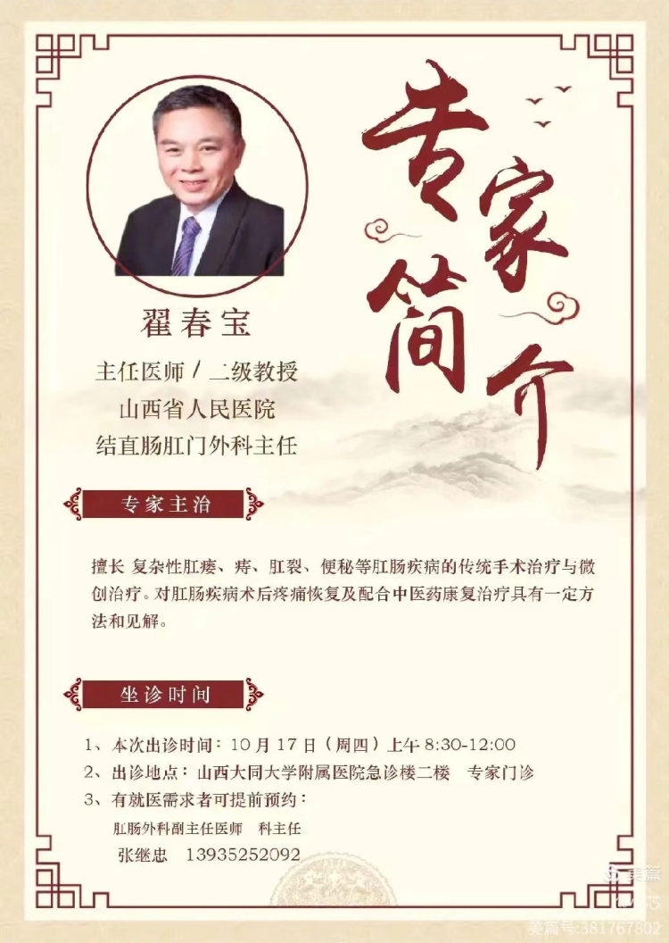 为进一步提高医疗服务水平,满足广大患者的就医需求,肛肠医院专门成立山西省人民医院肛肠科翟春宝工作室,建立了长期帮扶合作关系,定期来该院坐诊、查房、手术。翟春宝教授在山西省肛肠疾病方面享有极高的声誉,具有深厚的医学理论基础和丰富的临床实践经验。多年来,在相关领域取得了众多显著的医学成果和科研成就,为广大患者提供了卓越的医疗服务和健康保障。
