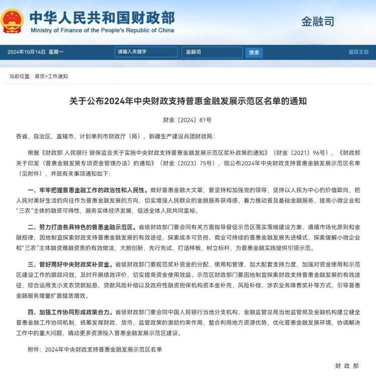 财政部发布《关于公布2024年中央财政支持普惠金融发展示范区名单的通知》,全国共89个示范区入选2024年中央财政支持普惠金融发展示范区名单。其中,重庆市潼南区、奉节县、秀山县3区县入选。
