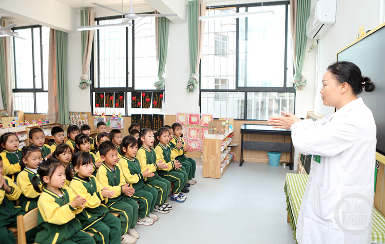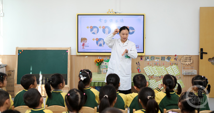 “掌心相对,手指并拢,相互揉搓;手心对手背沿指缝相互揉搓;掌心相对,双手交叉指缝相互揉搓……”10月14日,永川区青峰镇卫生院医务人员认真给青峰幼儿园小朋友讲解“七步洗手法”的注意事项。