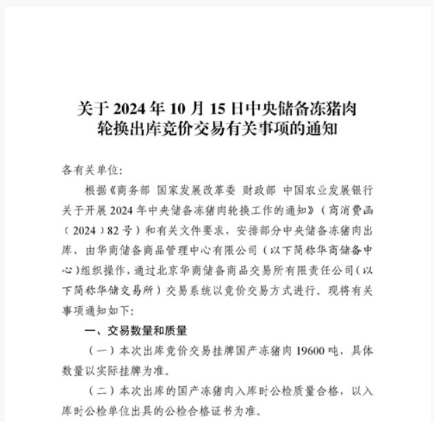 中新经纬消息,华储网14日发布《关于2024年10月15日中央储备冻猪肉轮换出库竞价交易有关事项的通知》称,本次出库竞价交易挂牌国产冻猪肉19600吨,具体数量以实际挂牌为准。