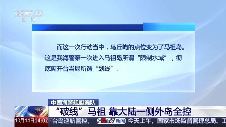 央视新闻客户端消息,今天(14日),中国海警局组织舰艇编队前往台湾本岛、东引岛、马祖岛附近海域开展执法巡查,环台岛巡航管控。其中,海警2901号万吨舰首次参加对台任务。