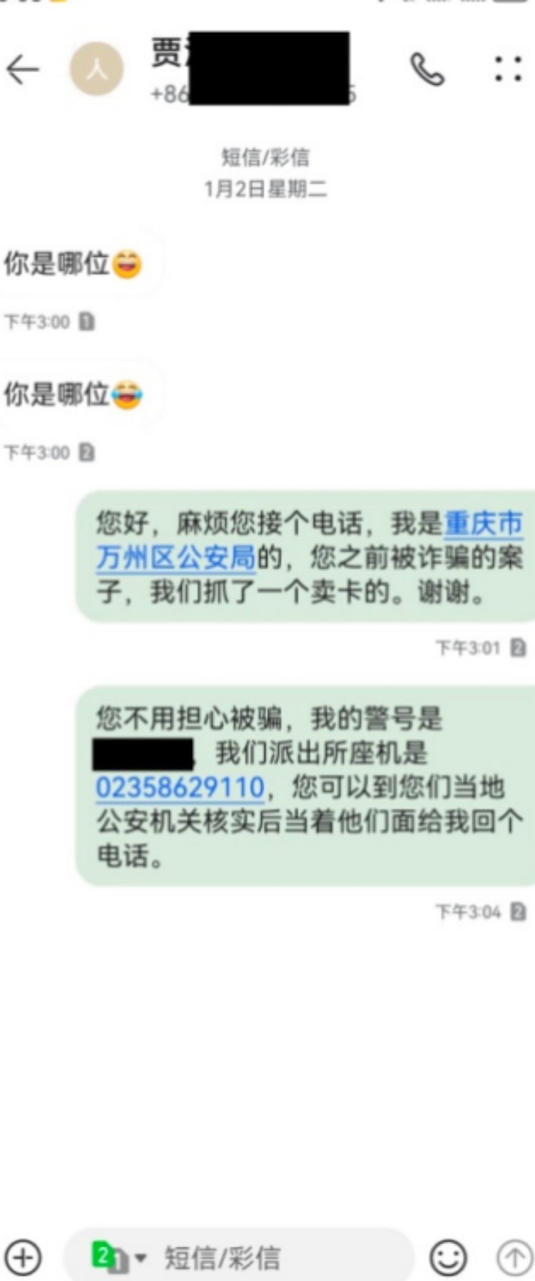 这是前段时间,万州区公安局后山派出所所长王进联系受害人贾先生返还被骗资金时,在短信上与受害人的对话。不过,令王进没有想到的是,贾先生“一朝被蛇咬”后,警惕性便提高了,竟误以为他是骗子,不停地挂电话。无奈之下,王进只好发短信先与其取得联系。