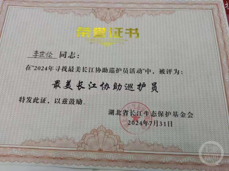 2021年以来,李世伦组织并参与护渔专项巡查733次,暂管渔竿195根、渔护9只、丝网5张,劝离一人多杆垂钓36人,劝离河道内垂钓100余次。2023年2月,李世伦因护渔巡查的责任水域禁捕效果明显,被武隆区农业综合行政执法支队给予表彰奖励。