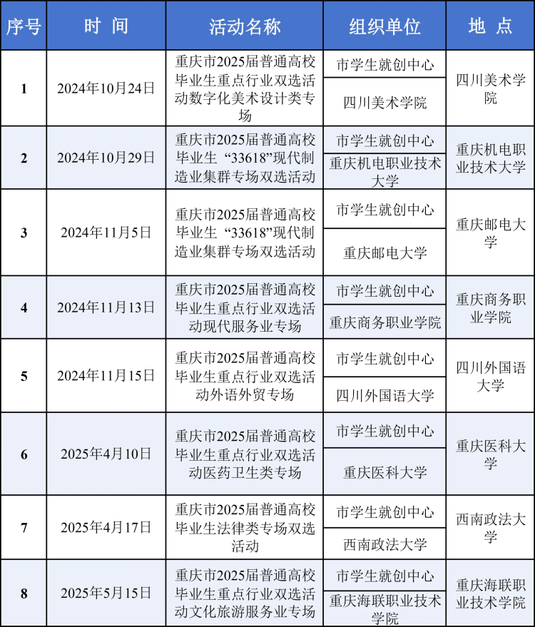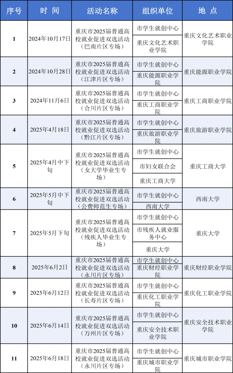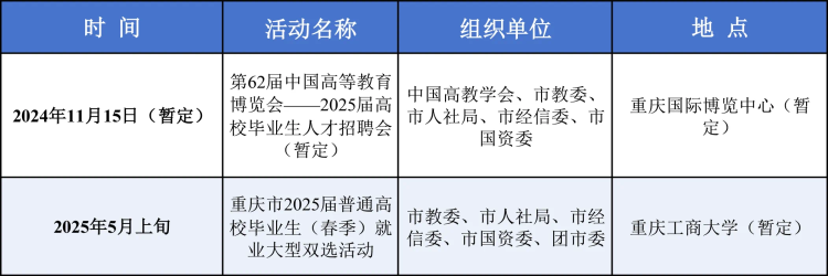 市学生就业与创新创业服务中心提醒,根据学校教学等工作的统筹要求,部分场次举办时间、地点、形式适时调整,高校毕业生可通过承办高校就业官网或重庆市普通高校毕业生智慧就业平台查询相关招聘信息。