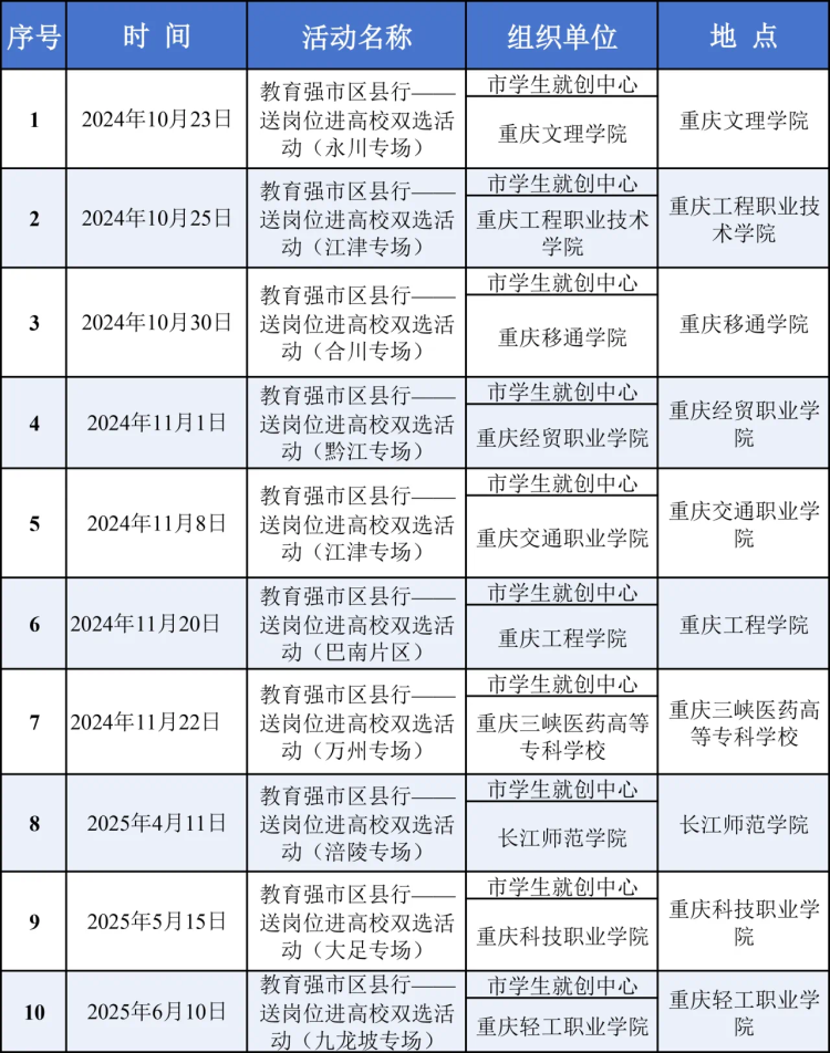其中,来渝留渝就业双选活动包括教育强市区县行——送岗位进高校10场和重点行业特色专场招聘8场。10月23日起,“送岗位进高校双选活动”将陆续走进重庆文理学院、重庆工程职业技术学院、重庆移通学院、重庆经贸职业学院、重庆交通职业学院等10所高校。