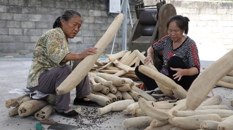 以前只能单卖的丝瓜络,现在经过加工厂机器压片、定型、缝纫等深加工,一根一米以上的丝瓜络就能实现150元的销售收入。细沙村党支部书记张坤说:“丝瓜作为一种天然原材料,制成的产品都可以自然降解,这是一个绿色环保的产业。”